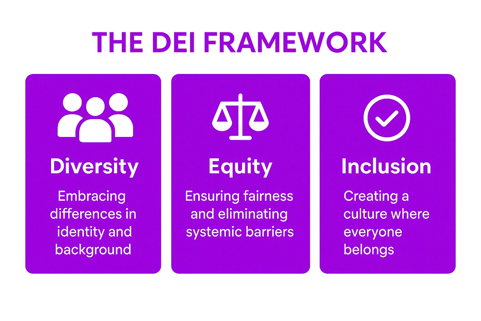 Diversity refers to the various characteristics that differentiate individuals within an organizational context, including aspects such as race, ethnicity, gender, age, and ability. Diversity, Equity, and Inclusion (DEI) represents a collective framework for fostering a workplace where individuals from diverse backgrounds feel valued, included, and have equal opportunities to succeed. These principles drive organizational policies aimed at eliminating barriers related to race, gender, ability, age, socioeconomic status, and other factors that have historically led to exclusion or inequality.