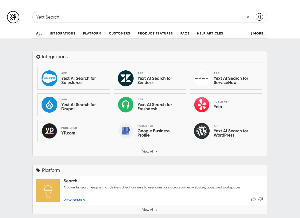 Rather than traditional document-heavy search, Yext excels at surfacing factual information such as policies, locations, FAQs, and standardized content. This makes it useful for reducing repetitive questions and supporting self-service.