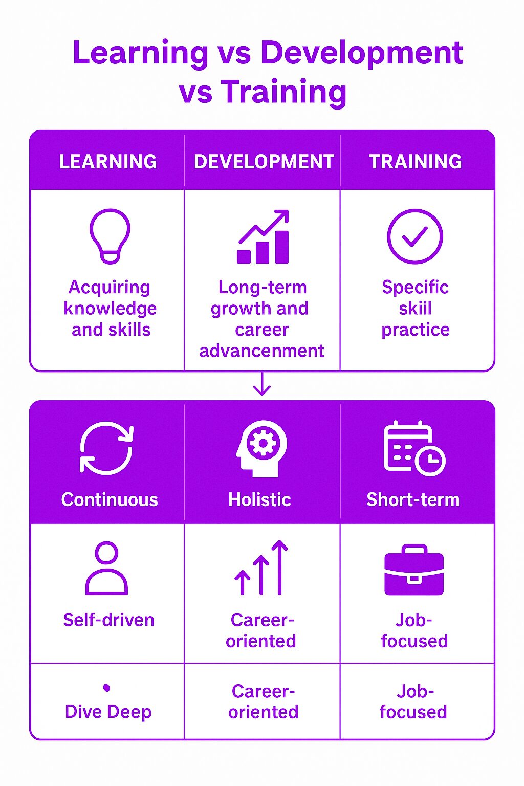 While the terms learning, development, and training are often used interchangeably, they serve distinct purposes within an organization. Learning is the ongoing process of acquiring new knowledge, skills, behaviors, and attitudes that enhance job performance. Development, on the other hand, focuses on the broader and deeper growth of an individual, aligning with their long-term professional goals and aspirations. Training is more specific; it involves structured instruction aimed at teaching employees particular skills or tasks required for their current roles. Although training is a crucial component of learning and development (L&D), it represents just one facet of a comprehensive L&D strategy. Understanding these differences helps organizations design more effective programs that cater to both immediate needs and long-term career development.
