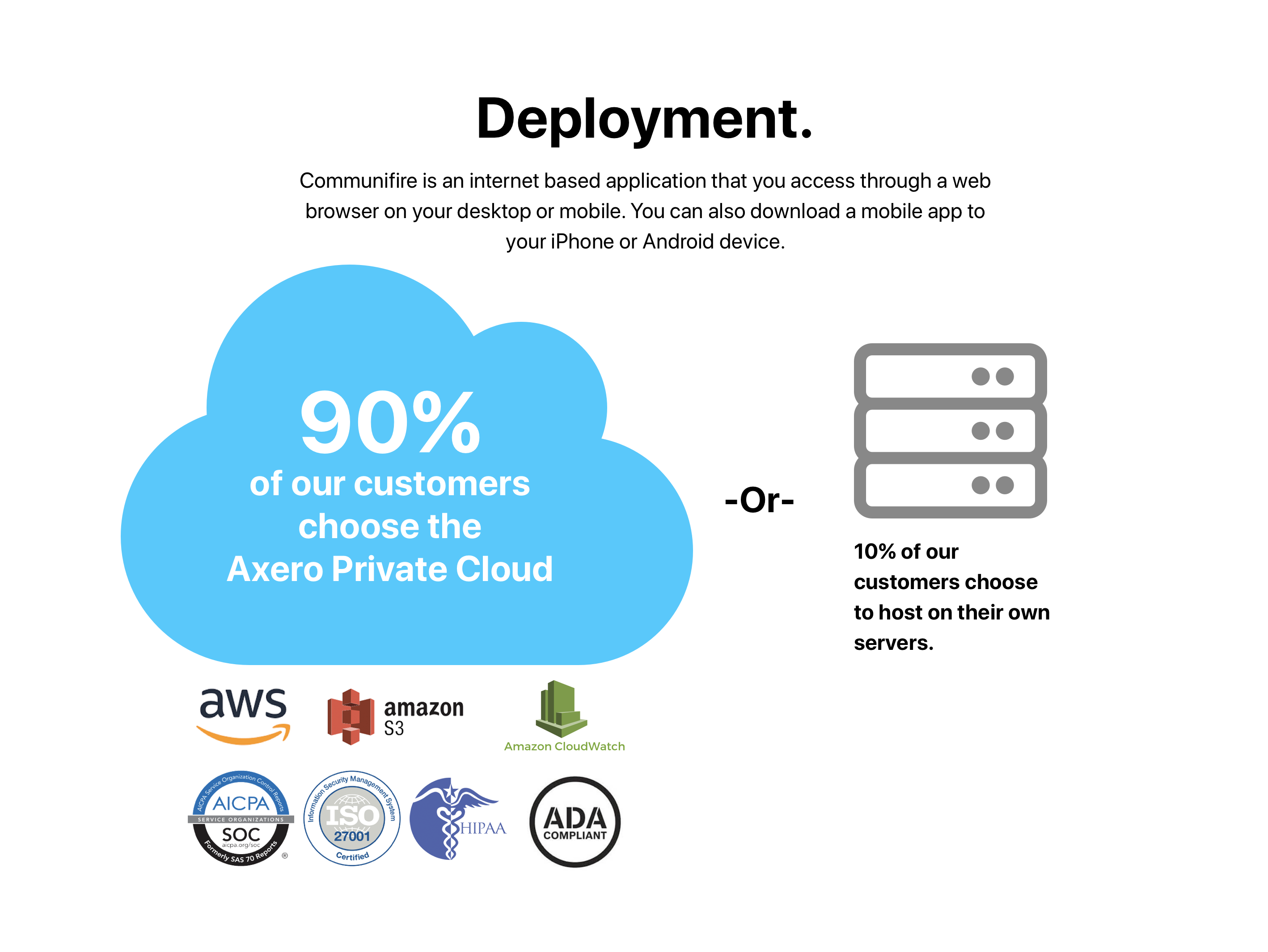 This is a web based application you access through an internet browser. The majority (90%) of our customers choose to host in our private Amazon AWS cloud because we handle all the work for you—security, installation, setup, configuration, and ongoing updates. Axero is a single-tenant application. This means that you get your own copy of the software and your own separate database–there’s no mingling of data with other customers.