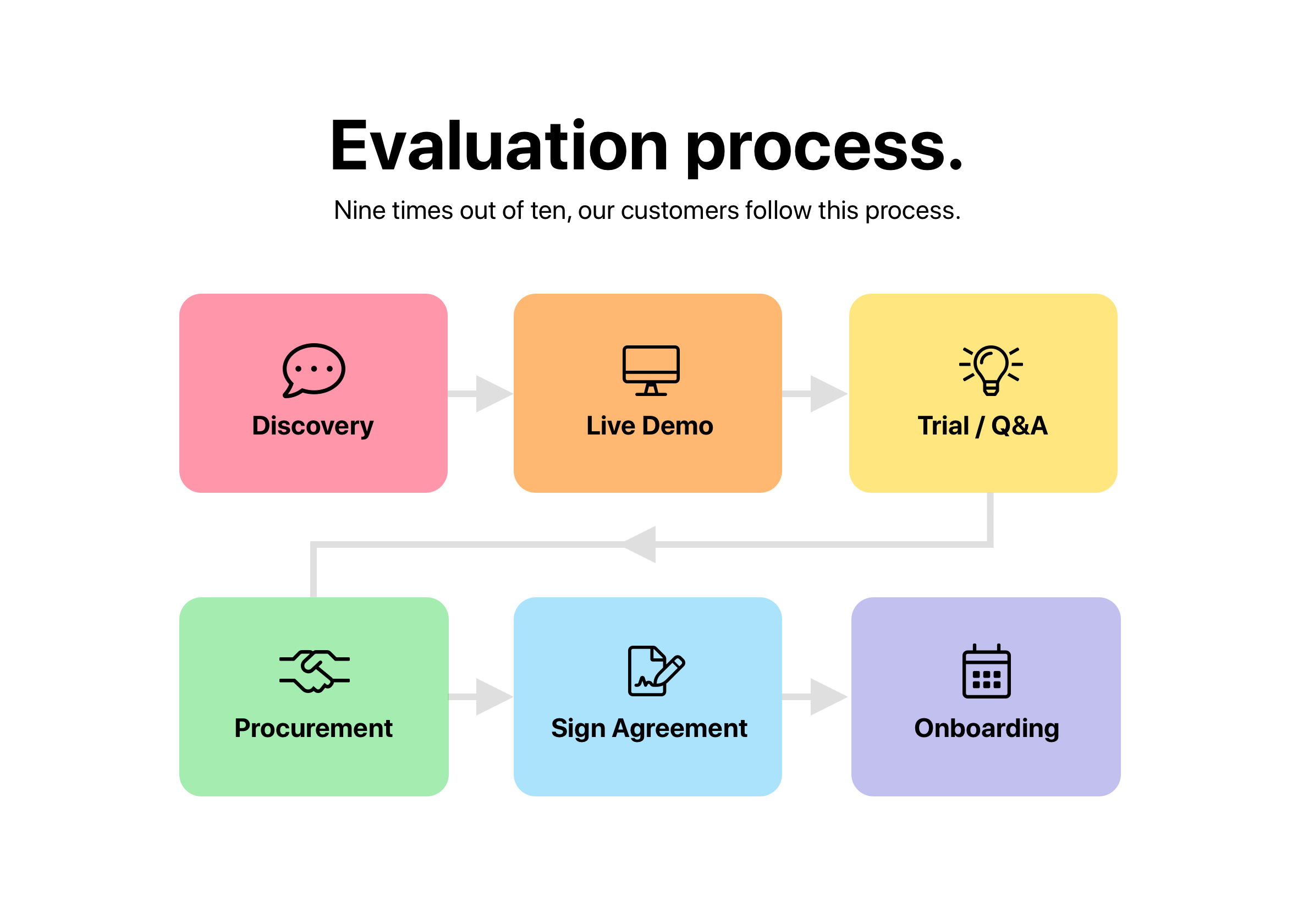 We eliminate the fear, confusion and stress, and give you clear a path—so you know what you’re getting into and how to get there. With the agreement out of the way, your sales representative will introduce you to our Customer Success team. We follow this plan of action: