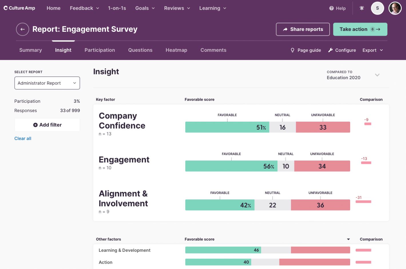 The platform offers engagement surveys, performance reviews, and development tools that help organizations understand and act on employee feedback. Culture Amp’s benchmarking capabilities allow teams to compare results against industry data.