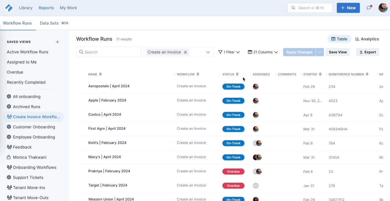 - Process reporting: Monitor completion and performance across teams.